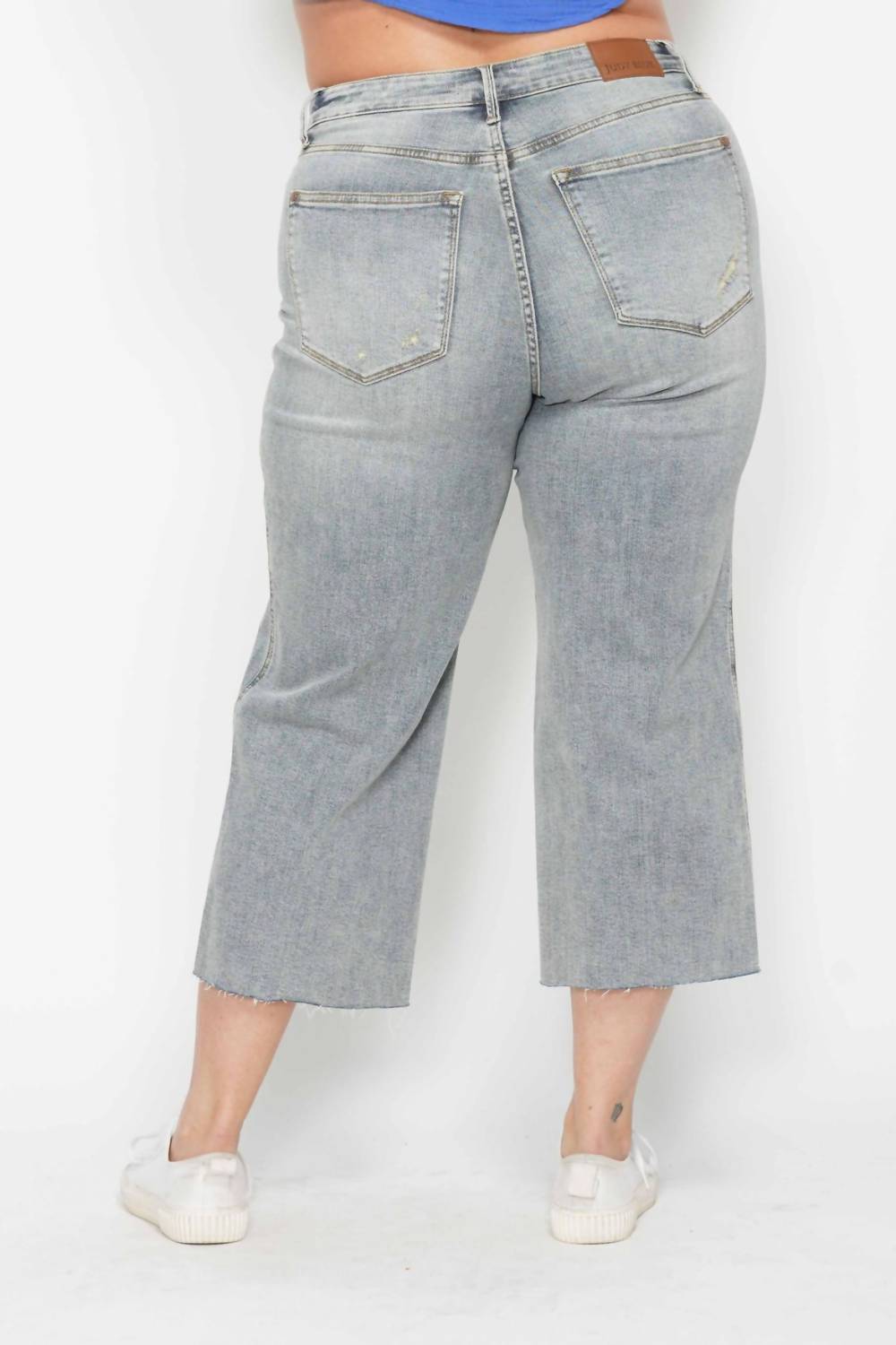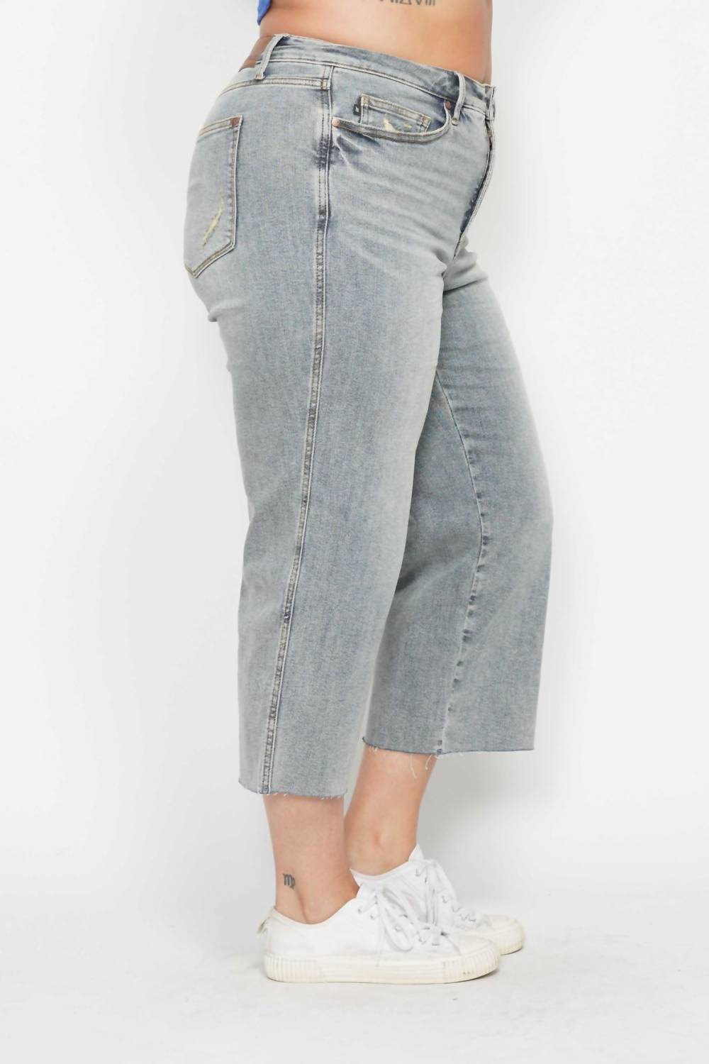 Tão fofos quanto confortáveis. Eleve seu guarda-roupa de viagem de primavera com a Calça Jeans Judy Blue Cropped de Cintura Média com Controle de Barriga e Perna Larga em denim. Esta calça jeans plus size é confeccionada em uma mistura de algodão com 91% algodão, 7% poliéster e 2% elastano, oferecendo um caimento relaxado e uma cintura média que valoriza o corpo. Com 29 cm de comprimento e 62 cm de comprimento, esta calça apresenta um padrão sólido e estilo de perna larga, além de um prático fecho de botão e bolsos. Projetada para conforto e estilo, ela é perfeita para reuniões de Ação de Graças e para acompanhar as tendências com uma homenagem à moda Y2K.
