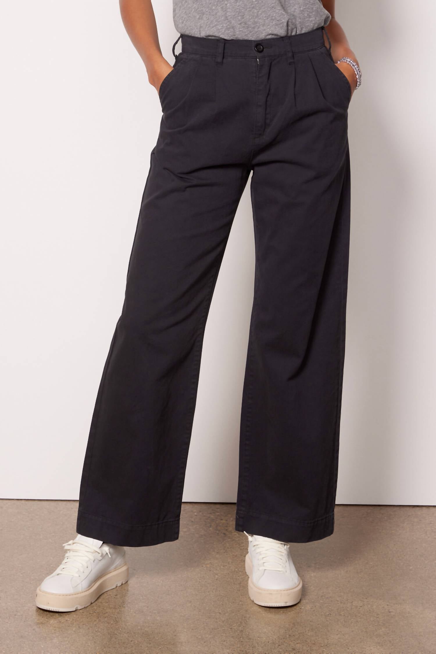 Braguilha com zíper e fecho de botão. Bolsos laterais inclinados. Bolsos embutidos traseiros. Tecido de sarja plissado. 56 cm no joelho, afunilando para 25 cm na abertura da perna. Tamanho real. Lavar à máquina com água fria.