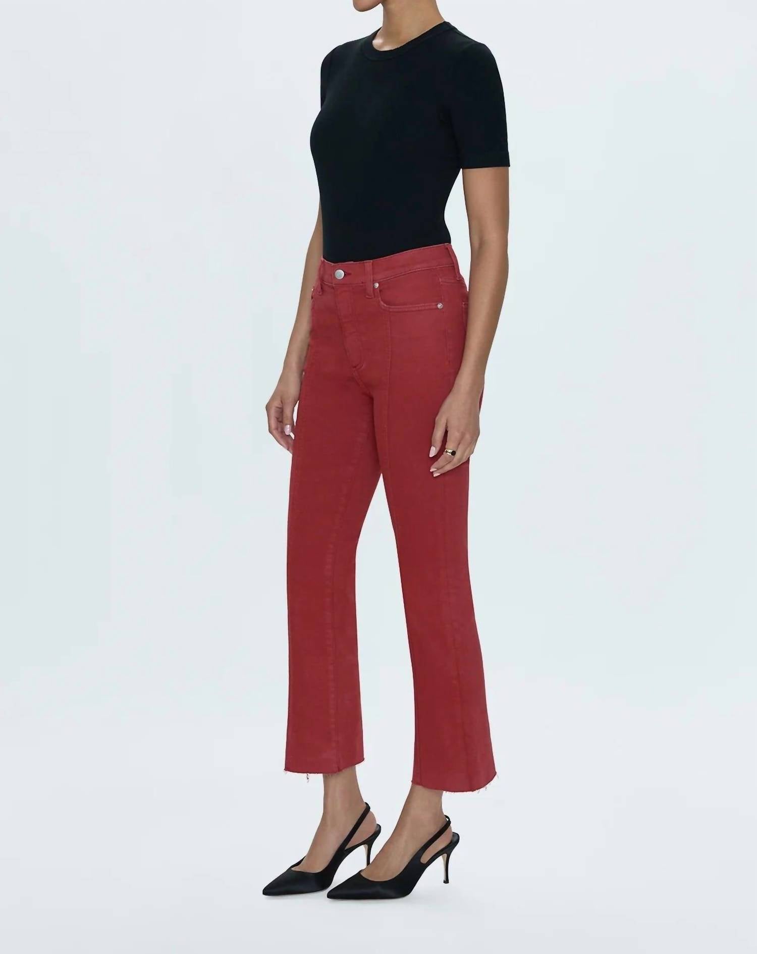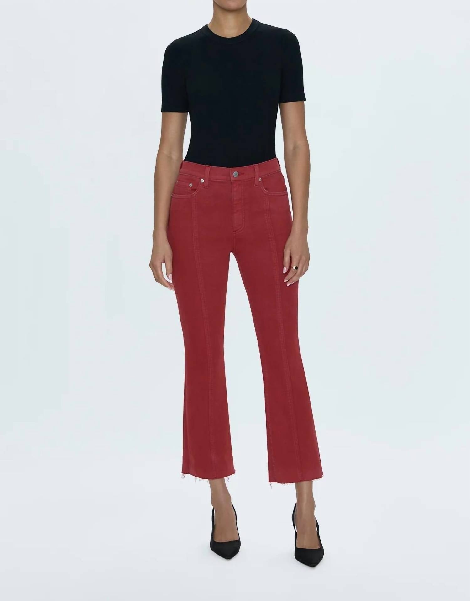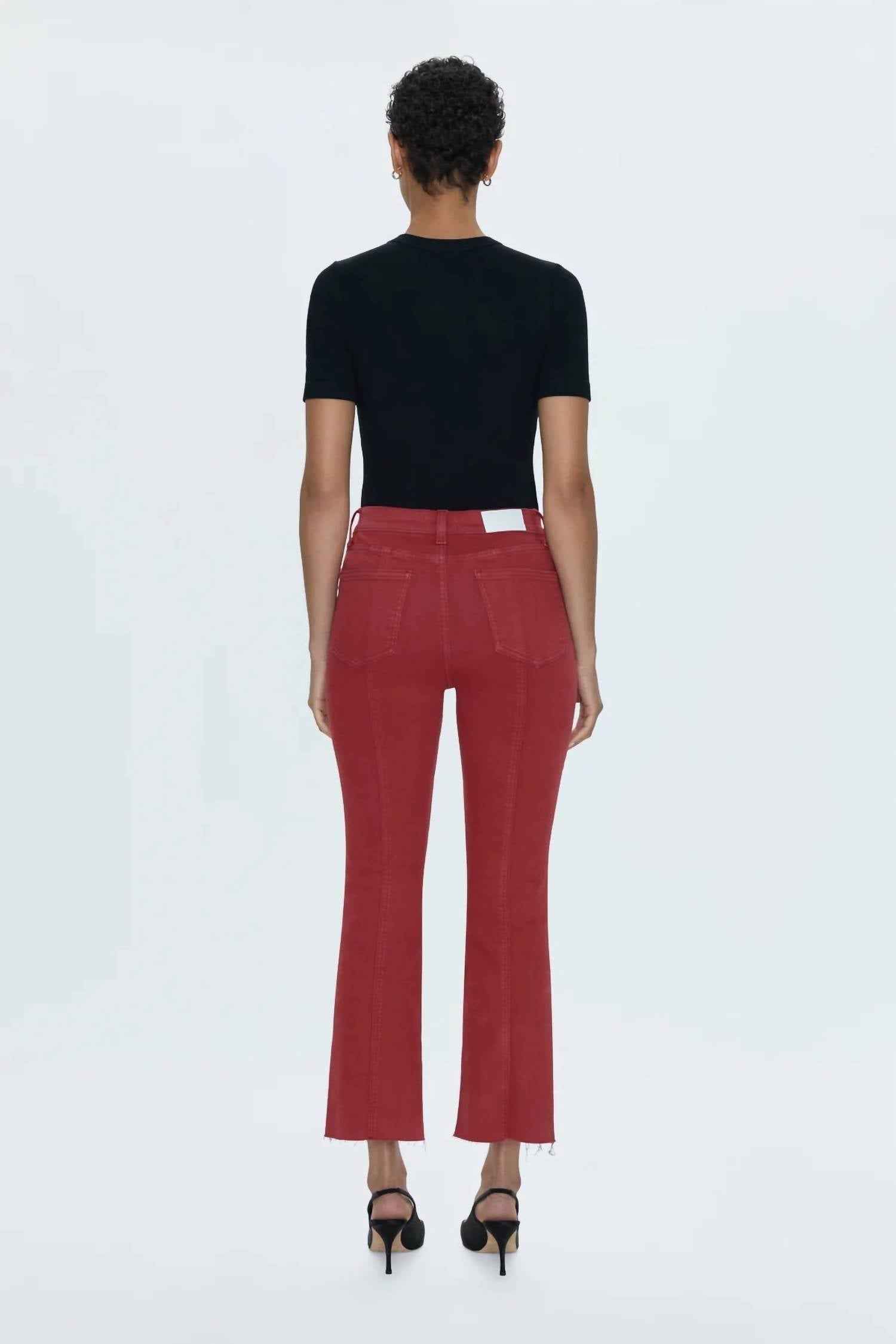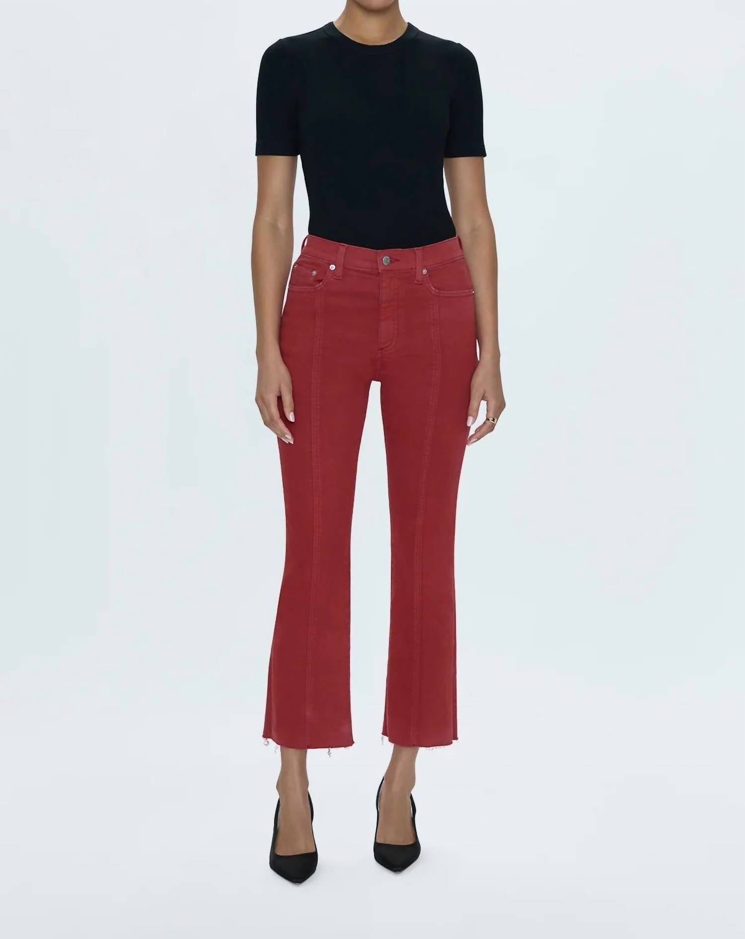 Mantenha-se na moda e exiba seu gosto impecável com estas calças cropped adaptáveis e estilosas. O comprimento perfeito para usar com suas mules favoritas. Você vai adorar o caimento! Apresentamos a Calça Lennon com Costura Alta e Cós Alto Crop Bootcut da PISTOLA, confeccionada com perfeição para estilo e conforto. Desenhada com cintura alta, esta calça apresenta barra curta no tornozelo e perna bootcut, tudo em um tom Rouge vibrante. Confeccionada em um confortável mix de algodão com caimento superelástico, possui costuras franzidas na parte frontal das pernas e acabamento em corte tesoura. Fechamento: Zíper. Cuidados: Lavar à máquina. Especificações: 28 cm de altura, 68 cm de comprimento.