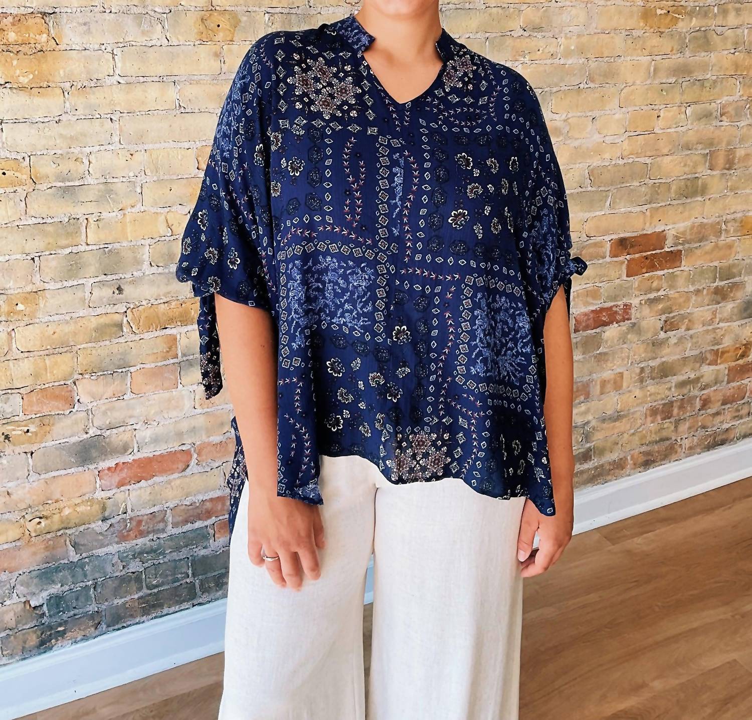 ReneeC. apresenta a blusa Boho Paisley na cor Azul-Marinho, um item essencial para adicionar um toque boêmio ao seu guarda-roupa de primavera. Esta blusa plus size apresenta mangas 3/4 com amarração divertida e um fecho confortável, exalando um estilo despojado. Confeccionada em 100% rayon, esta blusa é orgulhosamente fabricada nos EUA, incorporando uma estética boho-chic e despojada. Cuidados: Lavar à máquina com água fria e pendurar para secar.