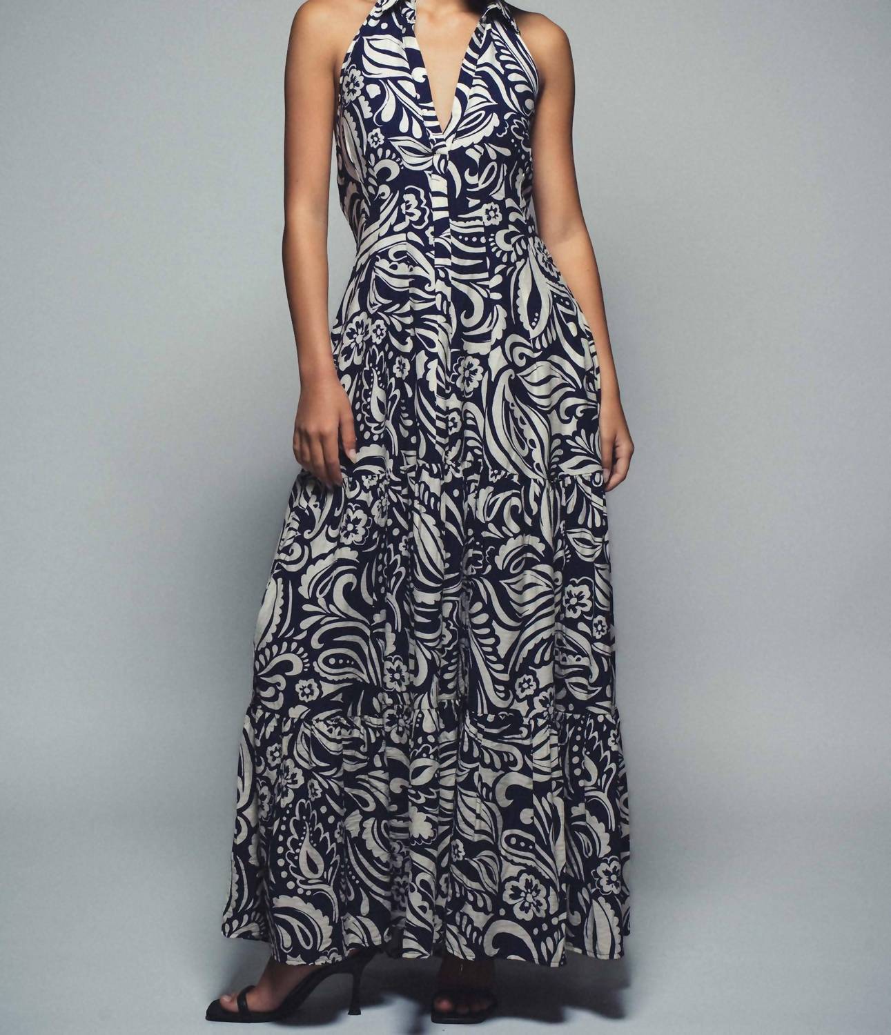Style this maxi with your favorite statement necklace and sandals for the perfect look. Introducing the Urban Daizy Halter Tiered Maxi Dress, a stunning choice with its abstract floral pattern in elegant navy. This sleeveless dress features a sophisticated halter neckline with a plunging V-front, complemented by an open back design. Created from 83% Rayon and 17% Nylon, this maxi dress is both comfortable and stylish, perfect for summer evening events or holiday getaways. Easily maintain its chic A-line silhouette with machine wash care, and enjoy the effortless pull-on closure for a seamless look.