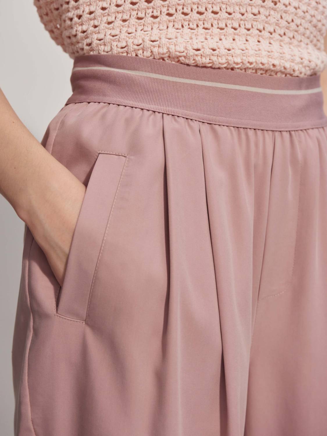 Abrace a elegância descontraída com um design em um tom de rosa-madeira. As calças de perna larga apresentam um estilo pull-on de cintura alta com 28 cm de altura frontal, complementado por uma costura interna de 73 cm para uma silhueta descontraída. Confeccionadas em 77% Ecocosy e 23% Sorona. Prometem conforto com frentes plissadas e bolsos laterais práticos. Os cuidados são simples: lavar à máquina em água fria, evitar alvejantes e secar na secadora, passar a ferro em água fria e lavar com cores semelhantes.