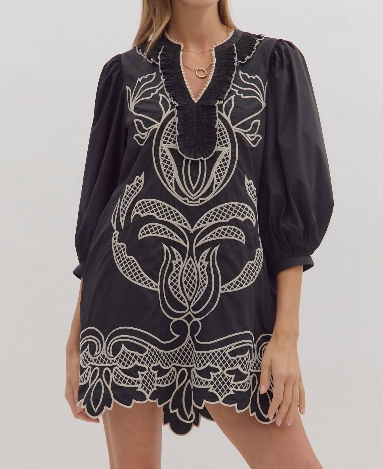 The kind of easy and flattering dress you'll be reaching for all season long. Introducing the Puff Sleeve Embroidered Scallop Hem Dress by Entro, an enchanting addition to your summer wardrobe in a timeless black. This patterned mini dress features elegant three-quarter puff sleeves, a scalloped hem, and a split V-neck with ruffled accents, complemented by a smocked back collar. Crafted from lightweight, woven material, it offers convenient side pockets and a pull-on closure. For care, simply hand wash and line dry.