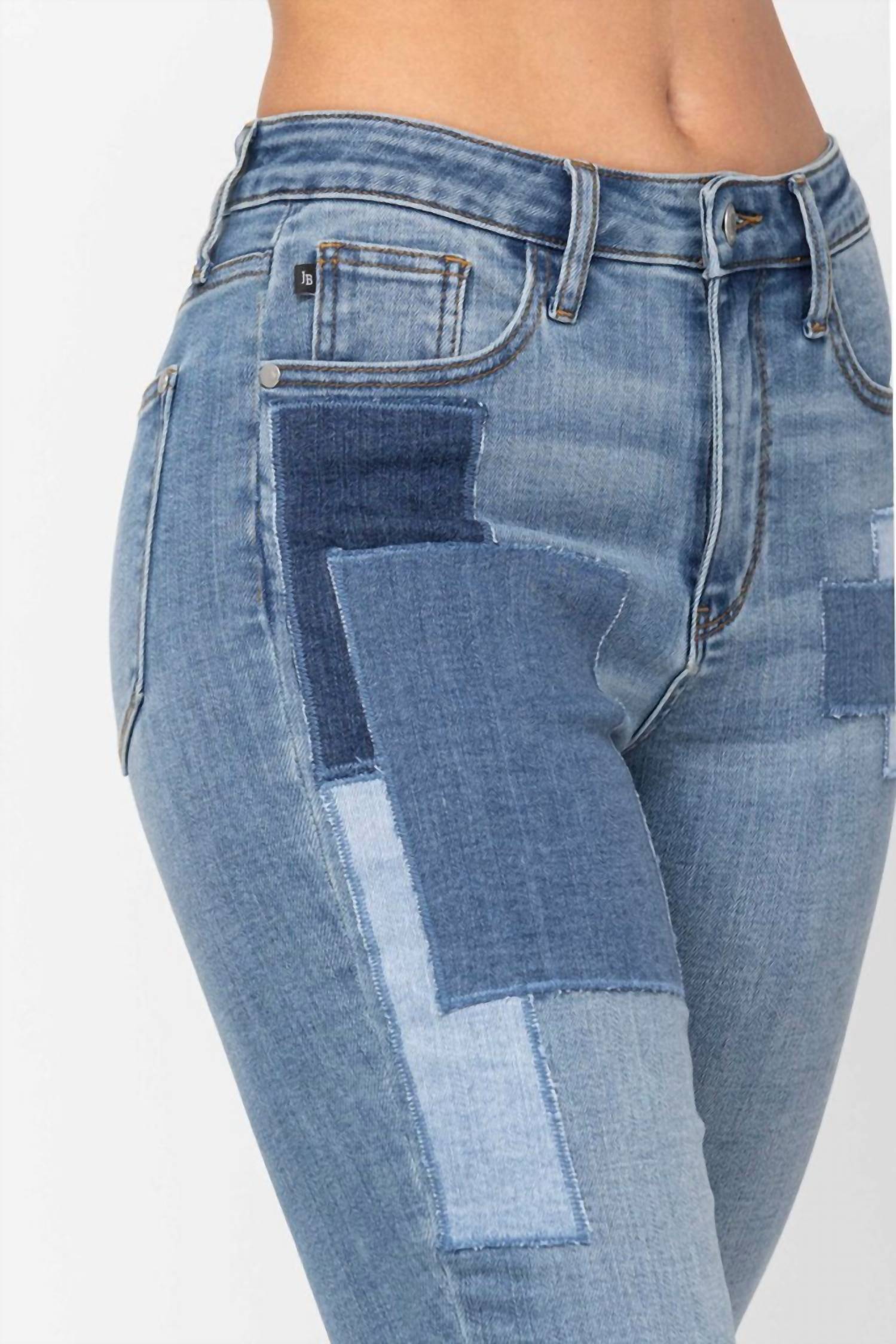 Judy Blue - Calça jeans boyfriend com remendo de cintura alta e punhos dobrados duplos