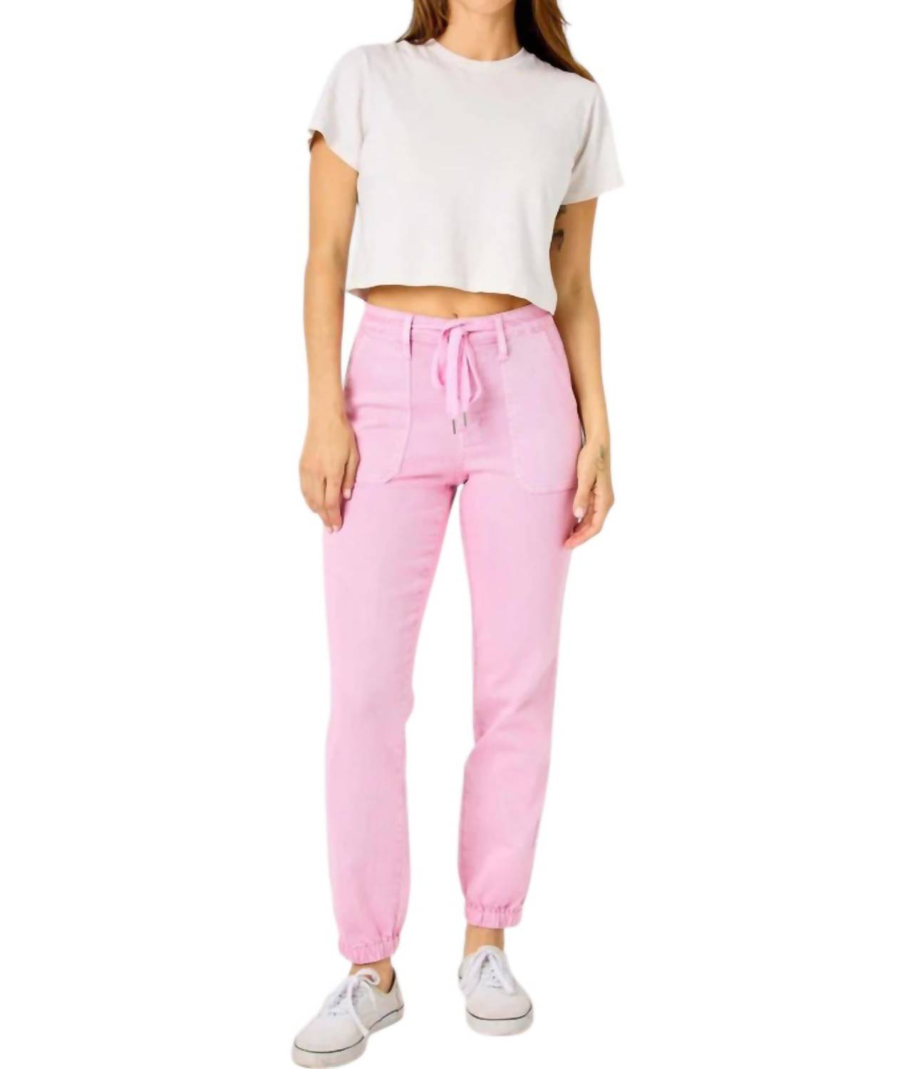 Cintura alta. Fechamento por botão e cordão funcional. Braguilha com zíper. Acabamento tingido. Silhueta jogger. 93% algodão, 6% poliéster, 1% elastano. Lavável à máquina.
