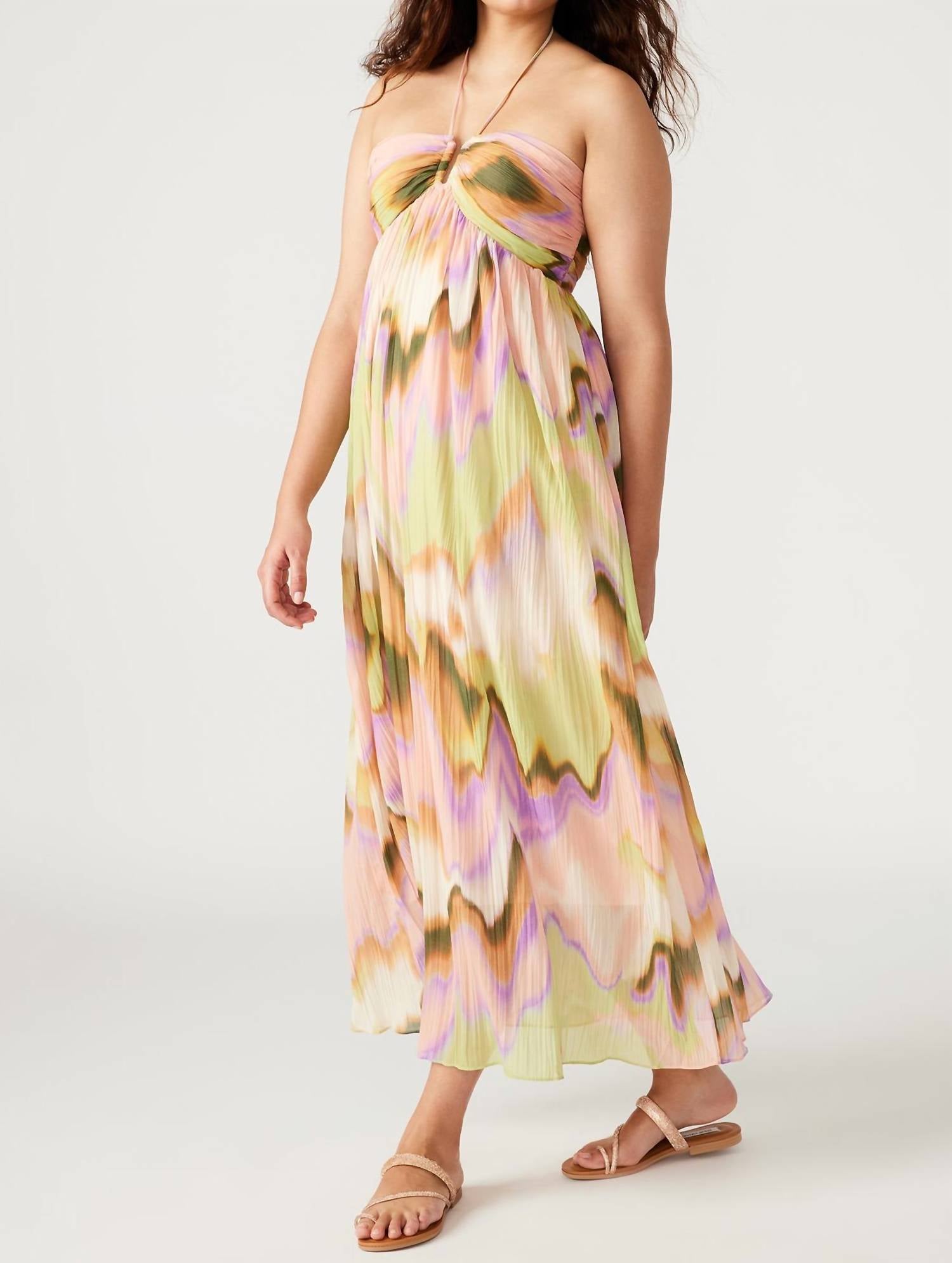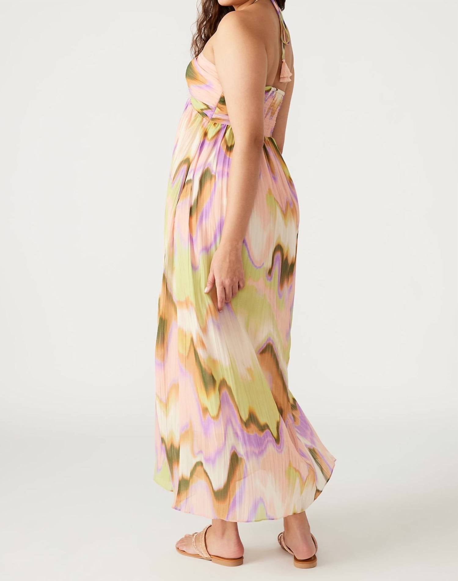 Um vestido longo que é tão fofo quanto confortável. Vestido longo frente única em aquarela. Tecido de chiffon plissado. Costas franzidas. Zíper lateral para vestir e tirar facilmente. Totalmente forrado. 100% poliéster. Lavagem à mão. Importado.
