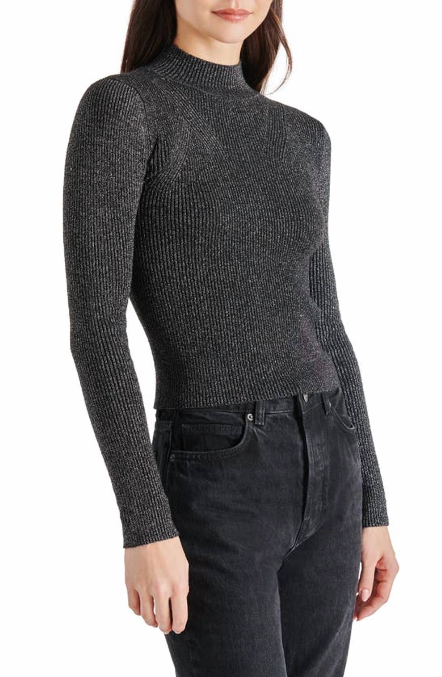 Ajuste perfeito e chique sem esforço. Suéter de gola falsa em malha canelada com acabamento canelado. Mangas compridas. Comprimento de 57 cm (tamanho extragrande). Fiel ao tamanho. 43% viscose, 26% nylon, 24% poliéster, 7% fibras metálicas. Lavar a seco ou à mão, secar na horizontal. Tamanhos: PP = 0, P = 2-4, M = 6-8, G = 10-12, GG = 14.