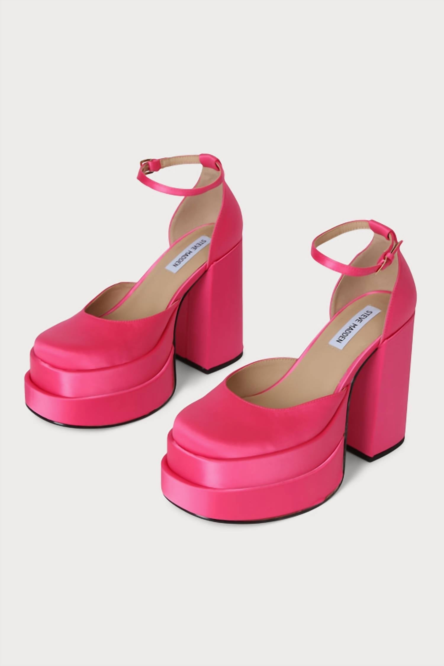 Eleve seu estilo com o Scarpin Steve Madden Charlize Rosa Cetim com Plataforma Dupla e Tira no Tornozelo, perfeito para chamar a atenção. Projetados com um design inspirado na Mary Jane, estes scarpins apresentam um elegante acabamento acetinado, bico redondo e gola baixa. A tira ajustável no tornozelo com fivela dourada garante o ajuste, enquanto o solado plataforma duplo de 5 cm e o salto bloco de 12 cm adicionam um toque dramático. Composição: Materiais sintéticos. Confeccionado em um design importado, este calçado oferece palmilha acolchoada e solado de borracha antiderrapante para conforto e estabilidade.