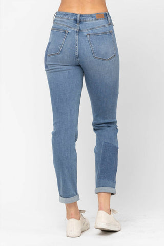 Judy Blue - Calça jeans boyfriend com remendo de cintura alta e punhos dobrados duplos