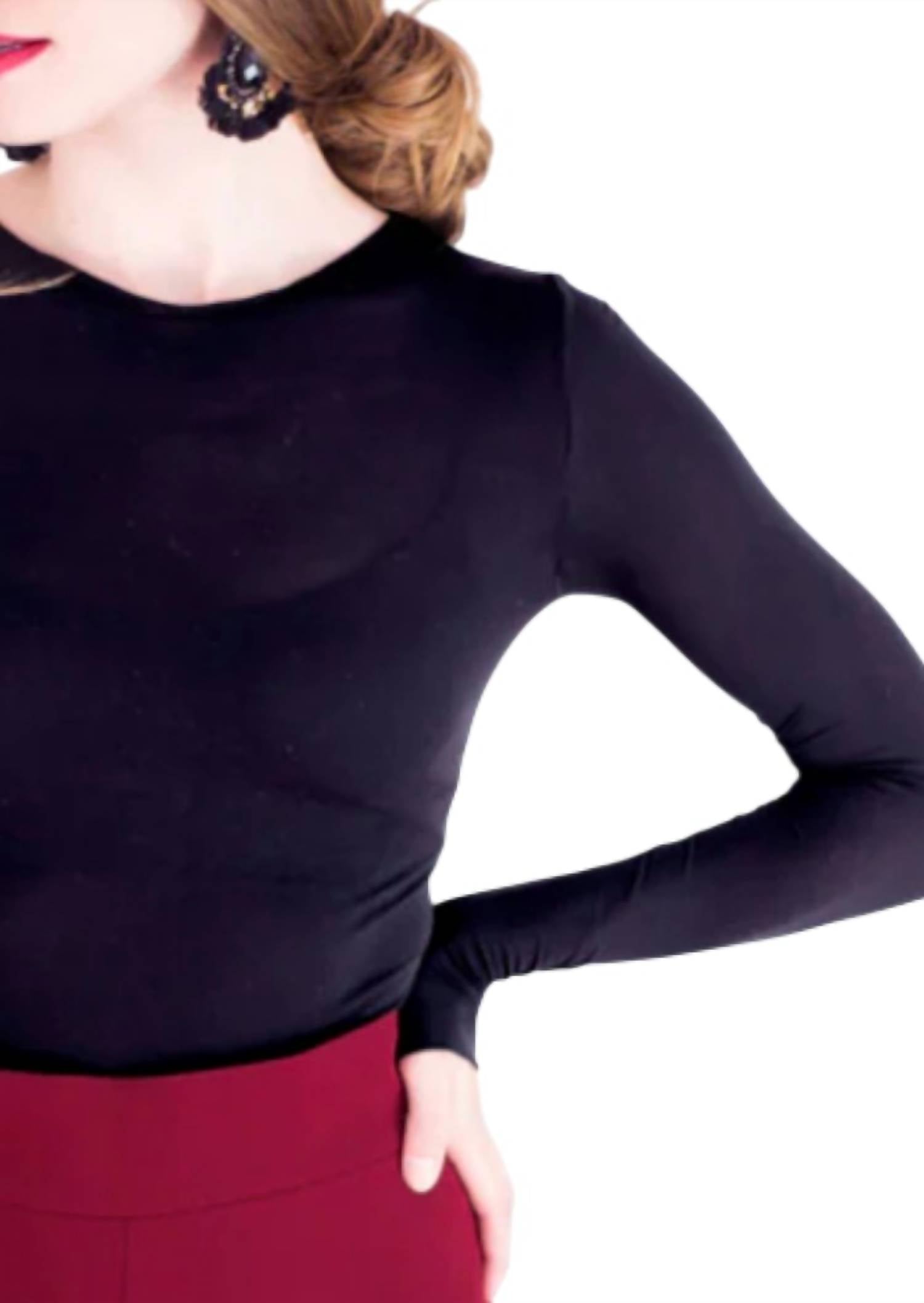 Great fit, cute design, soft fabric. You'll love everything about this long sleeve tee. Introducing the Solid Raw Edge Second Skin Top by AMB Designs, a must-have minimalist piece in black. This lightweight, semi-sheer long sleeve top features a crewneck design with a pull-on closure, offering a comfortable and generous fit that accommodates sizes 0-12. Crafted from a blend of 92% Nylon and 8% Spandex, it's perfect for layering and ideal for spring travel. Make this versatile top a staple in your wardrobe.