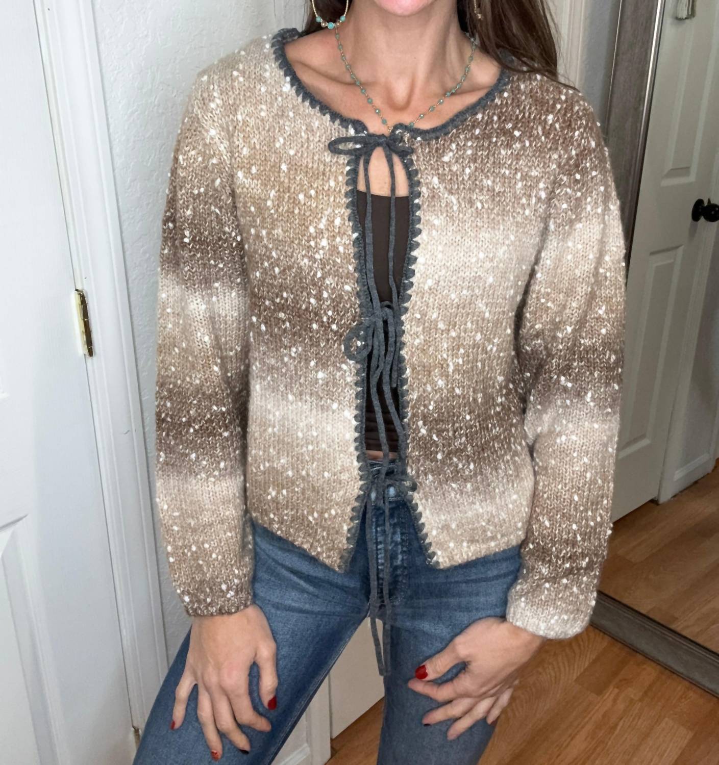 Introducing the Jordyn Ombre Tie Front Cardigan by AnnieWear, a chic addition to your wardrobe with its long sleeves and cropped length. This cardigan is crafted from a soft blend of 46% polyester, 41% acrylic, 8% nylon, and 5% wool, offering great stretch and a bit of fuzziness. The captivating brown and tan ombre effect, combined with off-white fabric dots and charcoal strings, adds a stylish dimension. Featuring a tie closure and elastic wrist cuffs, this piece is perfect for layering during the fall season.