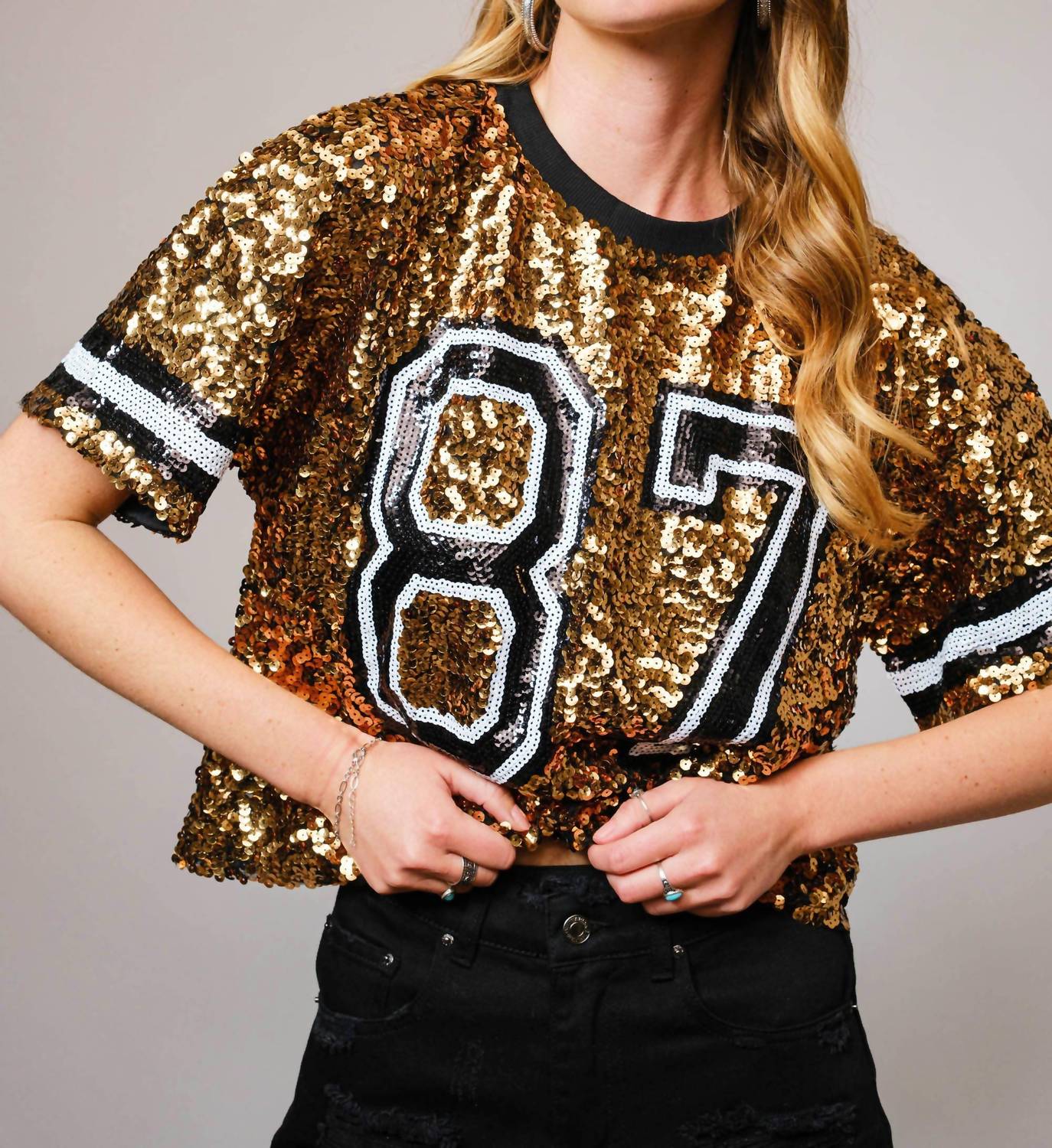 Não procure mais, você acabou de encontrar a camiseta perfeita! Brilhe no dia do jogo com o Top Crop Varsity Blue B Sequin Game Day em um tom dourado deslumbrante. Este top possui mangas curtas e gola careca, perfeito para um ajuste estiloso e confortável. Confeccionado inteiramente em 100% poliéster, possui fecho de pressão para facilitar o calce. Ideal para o streetwear de primavera, esta peça com estampa gráfica é tão chamativa quanto prática.