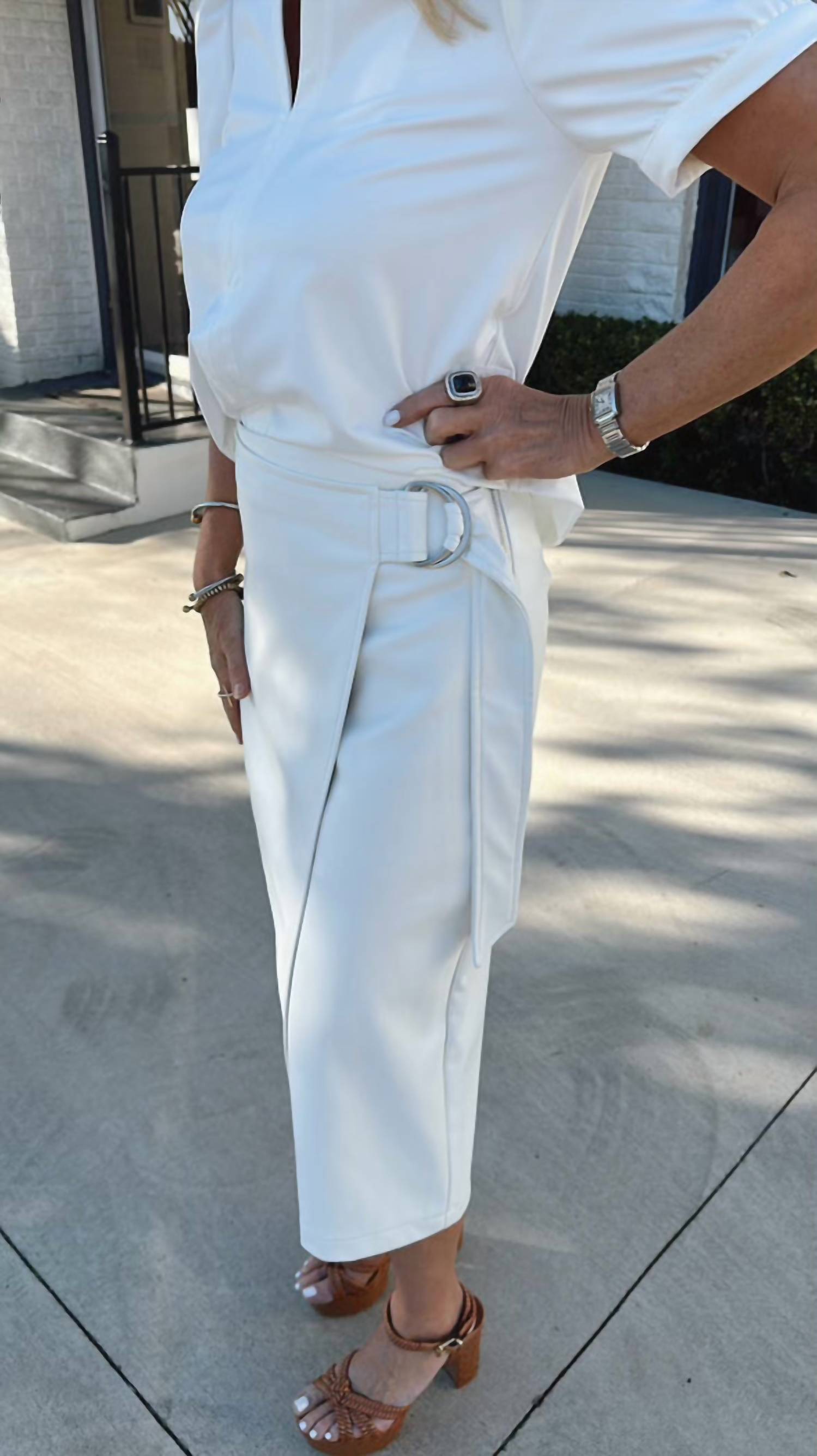 Coloque sua camiseta favorita dentro desta saia de comprimento midi para um visual descolado e descontraído. Adicione um toque de elegância rebelde ao seu guarda-roupa de primavera com a Saia Envelope de Couro Vegano DOLCE CABO na cor Branca. Com seu sofisticado comprimento midi e design envolvente, esta peça é perfeita para qualquer ocasião, com uma fivela lateral elegante. Confeccionada em couro sintético chique, ela oferece um toque ousado e, ao mesmo tempo, é amiga dos animais. Fechamento: Zíper lateral. Cuidados: Somente lavagem a seco.