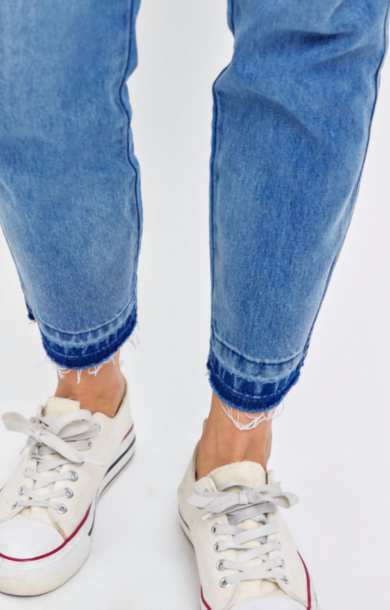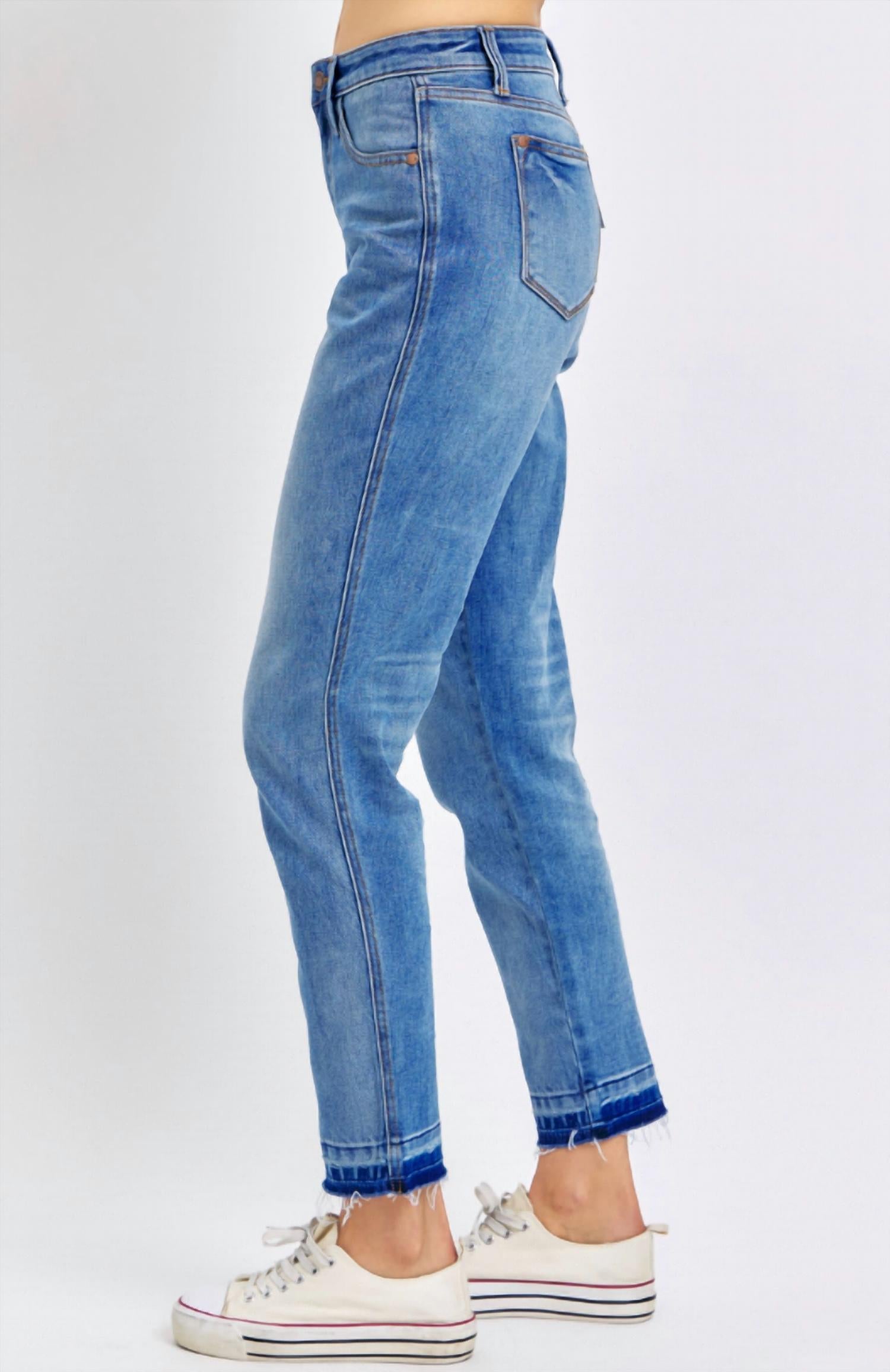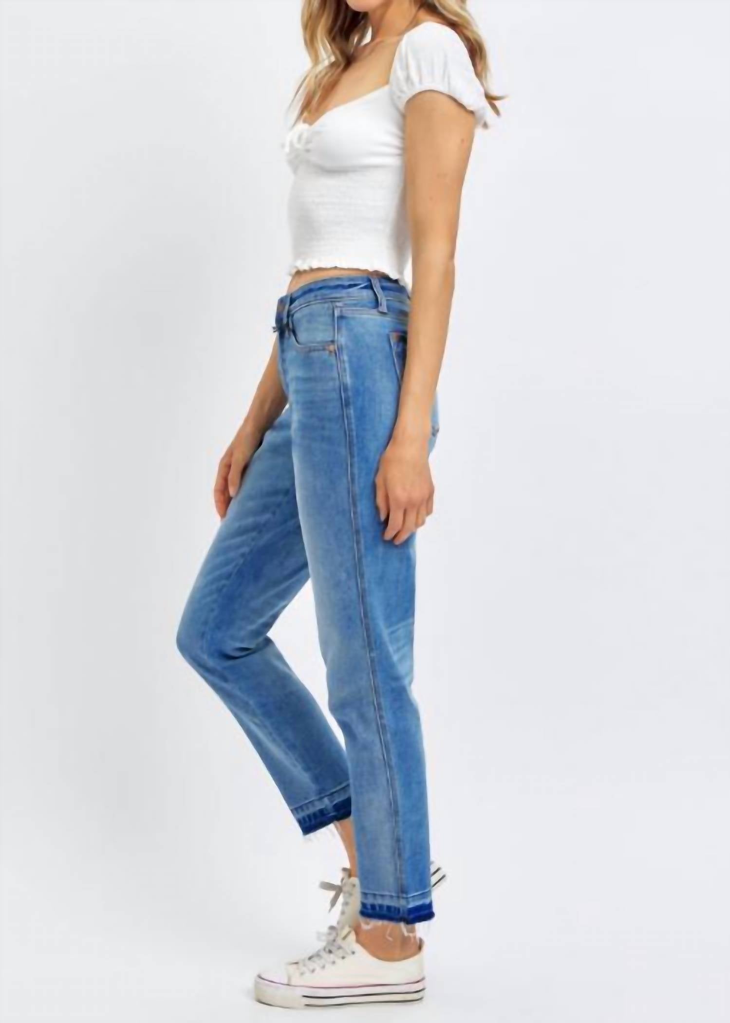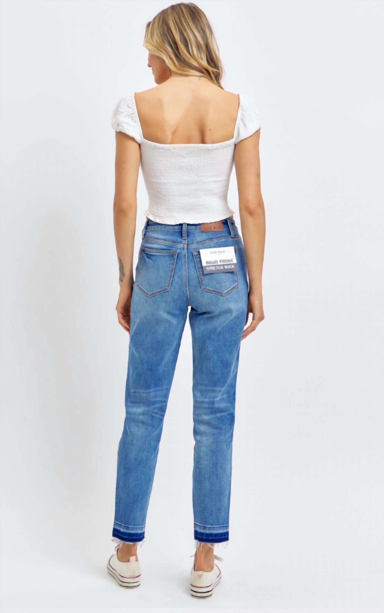 Quem não gosta de um bom macacão? Calça jeans rígida Judy Blue Magic Boyfriend de cintura alta. Jeans azul. Painel frontal: 71% algodão, 29% liocel. Painel traseiro: 76,2% algodão, 22,5% poliéster, 1,3% elastano. Corte reto. Barra com abertura. Cós frontal: 30 cm. Costura interna: 75 cm. Fecho de botão. Caimento elegante.