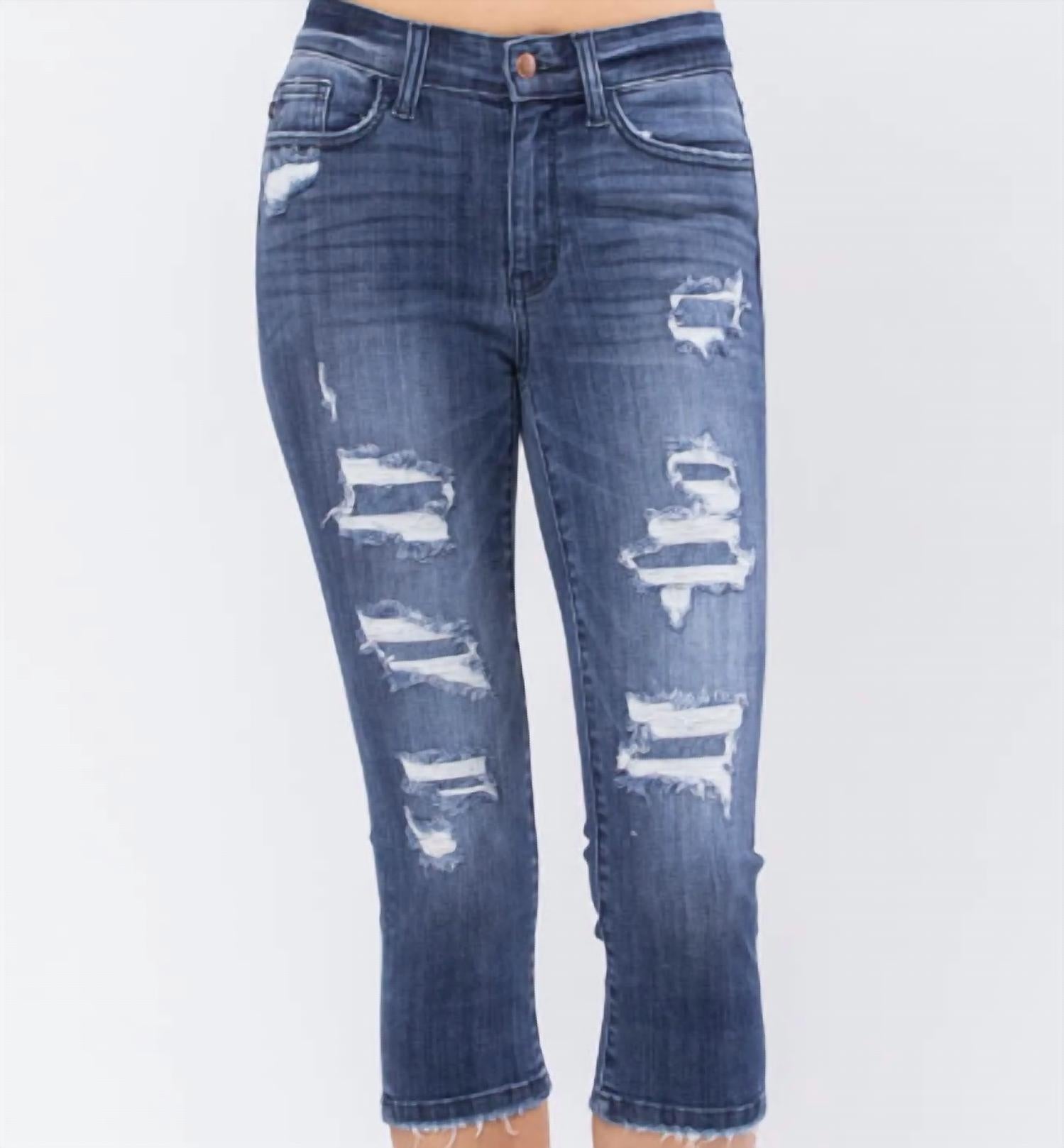 Discover the Women's Patch Capris by Judy Blue, beautifully crafted for real women who value comfort and style. These solid blue, mid-rise jeans are designed with an inseam of 9.5 inches, offering a perfect cropped length for summer vacations. Featuring a zip closure, they provide convenient wear and multiple pockets to enhance utility. Designed to stretch in all the right places, these capris ensure you remain comfortable all day long.