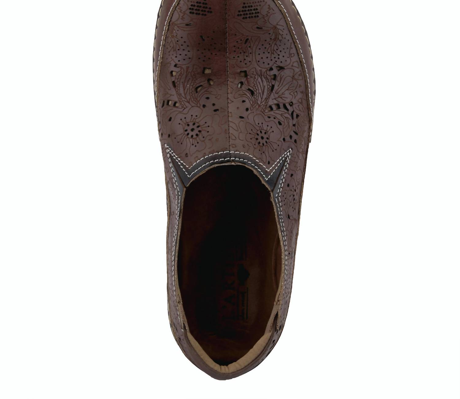 Experience the exquisite craftsmanship of the Women's Libora Leather Loafer by L'Artiste, a flat heel loafer with a chic 7/8 inch height. This French-inspired design boasts a hand-painted leather with beautiful flower perforated detailing and contrast stitching. The round toe shape and covered elastic goring provide comfort and style, complemented by synthetic leather lining and insole. The rubber outsole ensures durability, making it a perfect choice for any wardrobe.