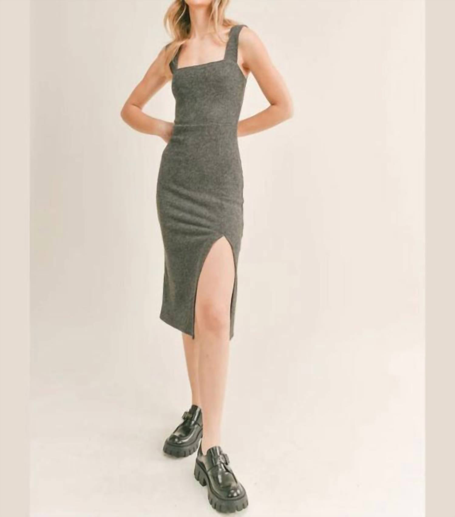 O vestido com o comprimento perfeito existe. Vestido midi de malha. Fenda frontal. 85% POLIÉSTER 15% Viscose.
