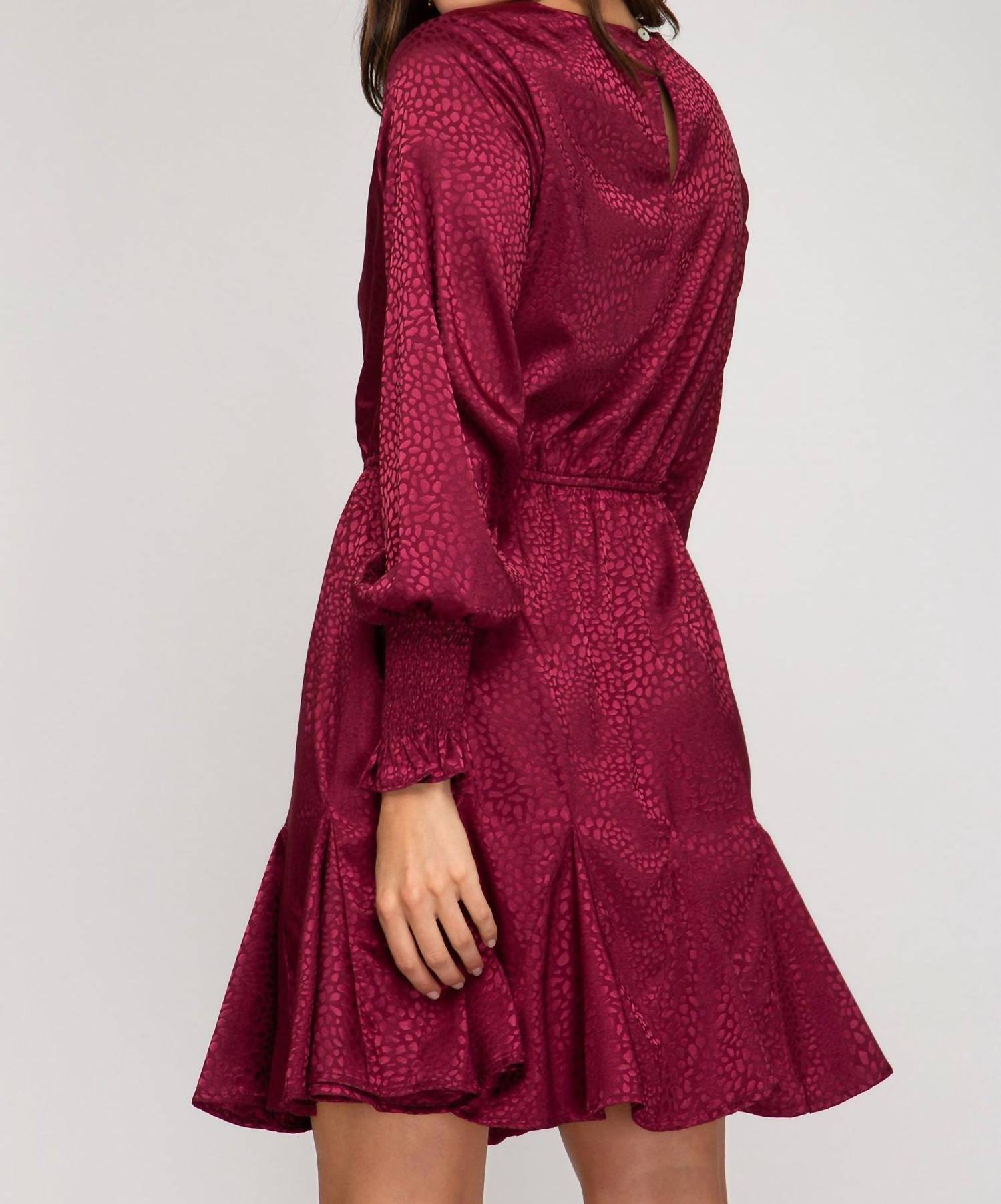 O minivestido perfeito para os meses mais quentes. Cor vinho intenso e estampa animal sutil neste vestido de seda. Mangas compridas com punhos elásticos na parte inferior dão às mangas um pequeno efeito balão.