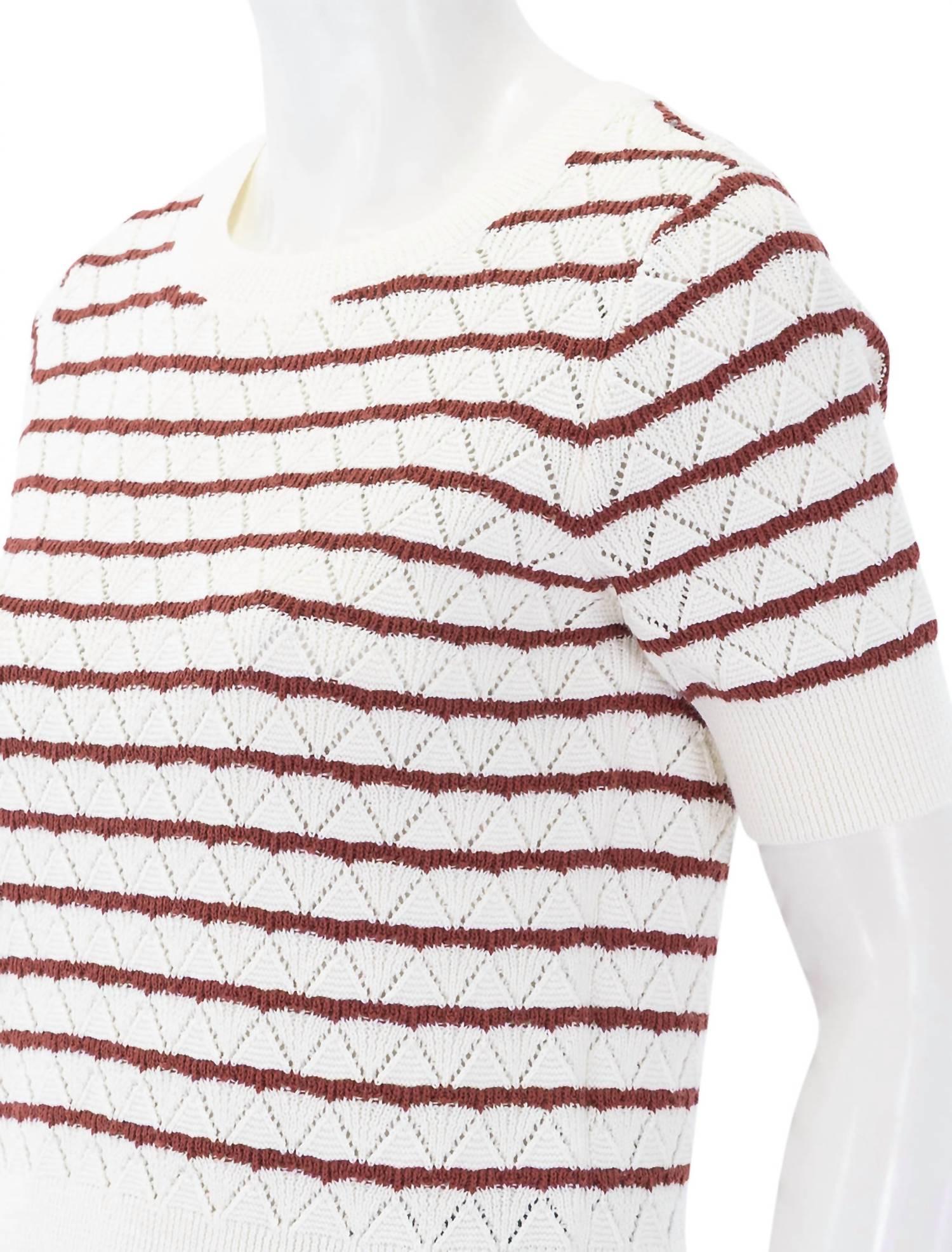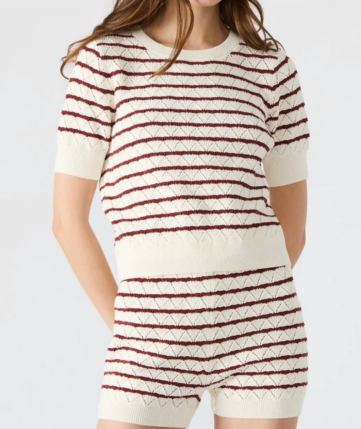 Apresentamos o suéter de manga curta Norris da Steve Madden, um item essencial para o seu guarda-roupa de outono, em um tom marshmallow encantador. Este suéter feminino é confeccionado em uma mistura de algodão, composta por 60% algodão e 40% poliéster, e possui um elegante padrão listrado, perfeito para ambientes de férias. Possui gola redonda e mangas curtas com fecho prático. Para maior durabilidade, lave à mão e deixe secar na horizontal.