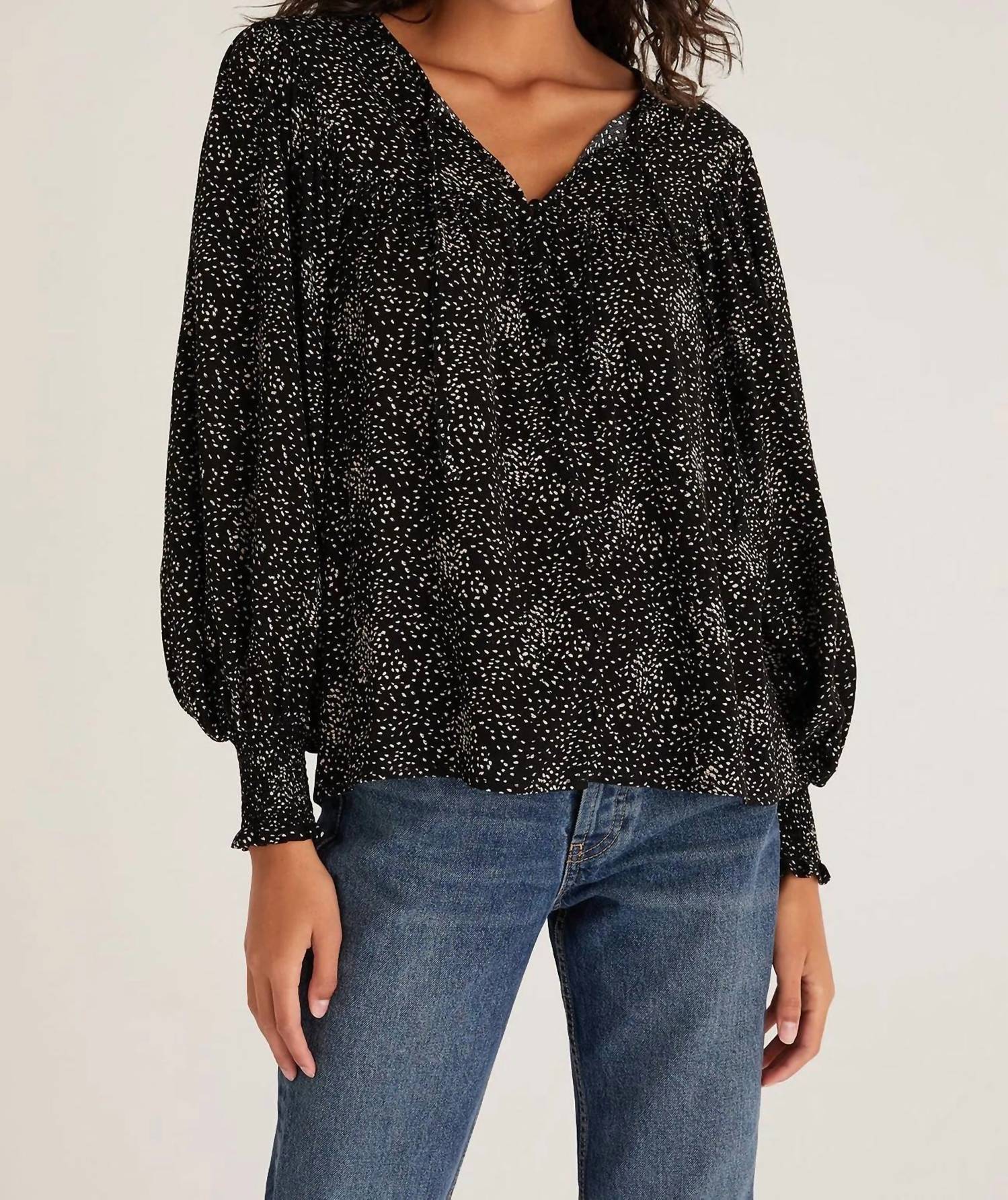 Easy, breezy, and anything but basic. The chic Miriam Dot Top adds a feminine touch and timeless appeal with its peasant-inspired design and full sleeves that bellow into smocking at the cuffs. Crinkle Rayon with our modern dot pattern makes this an item you won't want to pass up! Easy Fit. Model is wearing a Size S.