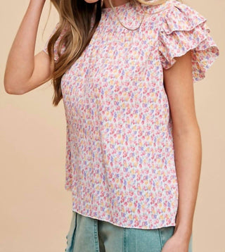Anniewear - Ditsy Flower Printed Pleats Blouse