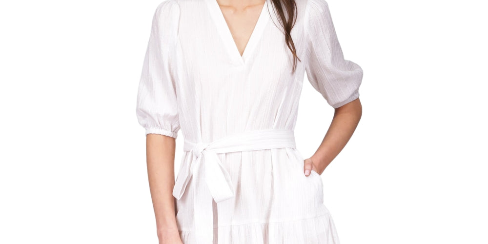 Vestido curto listrado monocromático com decote em V feminino Michael Kors, tamanho grande, branco