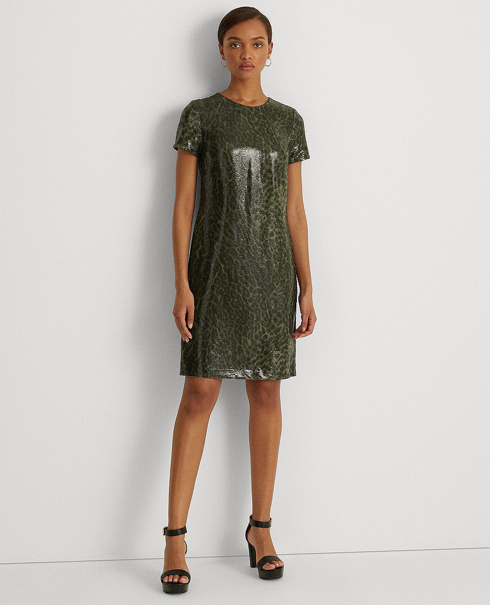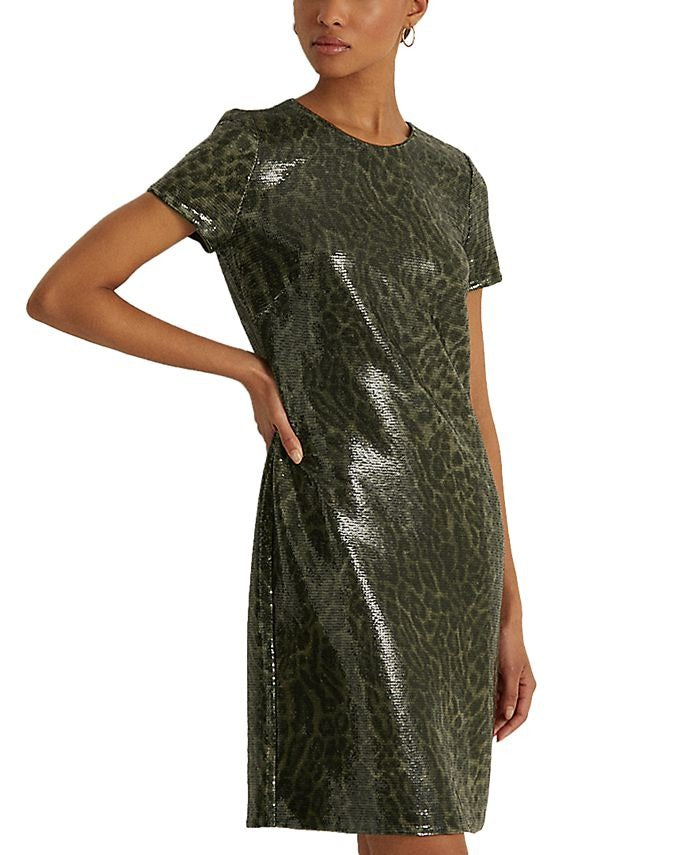 Vestido de coquetel Ralph Lauren feminino com estampa animal e lantejoulas, manga curta, gola redonda, acima do joelho