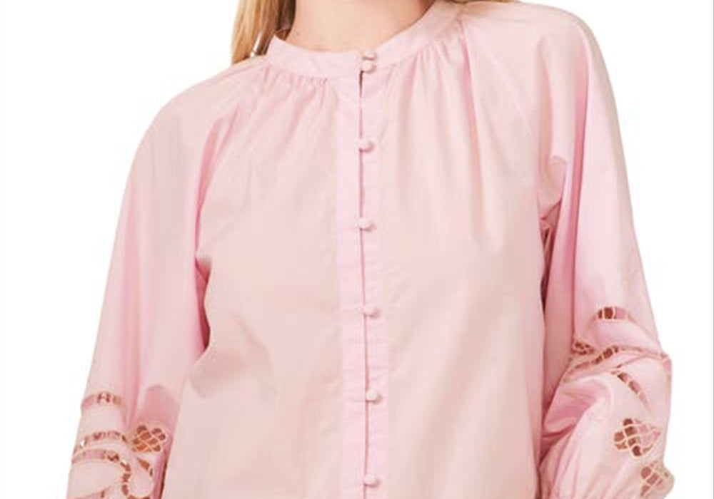 Material de popeline de algodão premium | Detalhes de bordado intrincados | Cor rosa horizonte chique | Tamanho extrapequeno confortável | Marca sofisticada Vince Camuto | Disponível na Nordstrom | Instruções fáceis de cuidar | Leve para uso no verão | Versátil para uso casual ou formal | Silhueta de blusa clássica