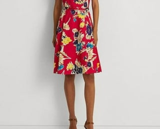 Ralph Lauren Saia plissada com zíper e cinto, forrada com estampa floral, sem mangas, decote quadrado, acima do joelho, vestido estilo coquetel, rosa, tamanho 2