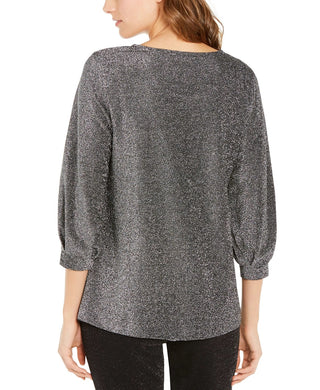 Blusa feminina Alfani de malha metálica com manga bispo, cinza, tamanho pequeno