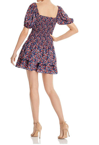 Vestido curto feminino Parker Floral, manga curta, gola quadrada, ajuste flare, azul, tamanho grande