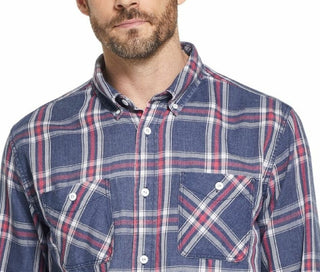 Camisa masculina vintage à prova de intempéries com botões frontais de flanela xadrez azul-marinho tamanho médio