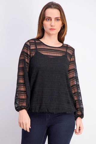 Blusa feminina Alfani Petite Sheer-Stripe com manga balão, preta, tamanho PL