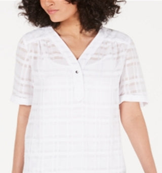 Blusa feminina xadrez com decote em V Alfani, branca, tamanho PS/M