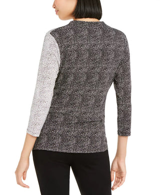 Camiseta feminina estampada Alfani com manga 3/4 e decote em V, preta, tamanho pequeno