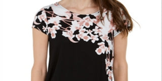 Camiseta feminina Alfani estampada com bainha redonda, preta, tamanho pequeno pequeno