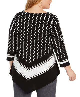 Blusa feminina estampada Alfani com bainha em V, preta, tamanho 1X