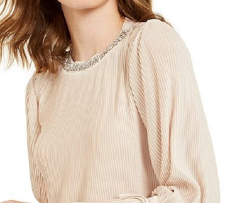 Blusa feminina Alfani com listras texturizadas e decote embelezado, bege, tamanho pequeno