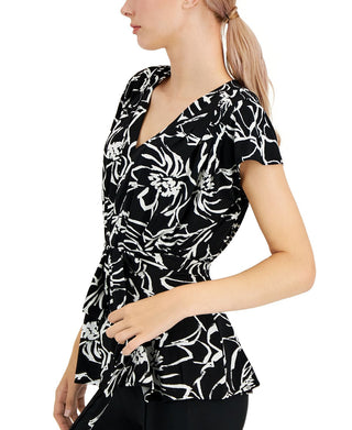 Blusa feminina Alfani com decote em V, plissada, cintura e manga curta, preta, tamanho médio