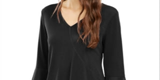 Blusa feminina Alfani com decote em V e acabamento em malha, preta, tamanho grande