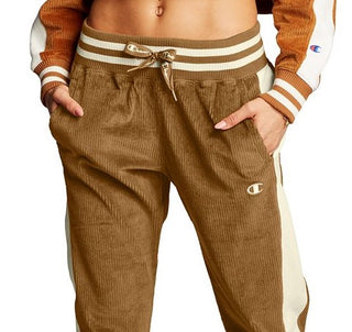Calça jogger feminina Champion com logo de veludo cotelê marrom, tamanho pequeno