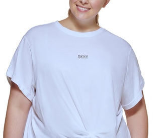Camiseta feminina DKNY com logo metálico frontal e nó, branca, tamanho 1X