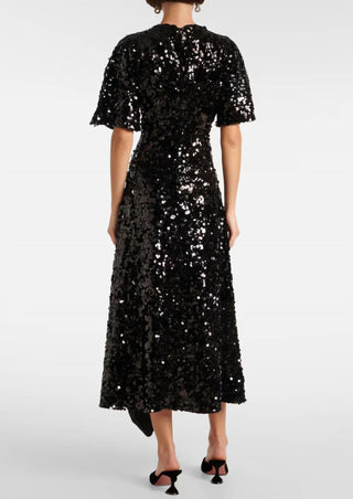 Ganni - Vestido justo com lantejoulas, gola longa e franzido