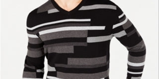 Suéter listrado texturizado com decote em V Alfani masculino, preto, tamanho grande