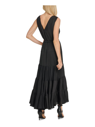 Vestido longo feminino DKNY com amarração na cintura e camadas, preto, tamanho extragrande