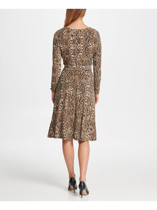 Vestido de festa feminino DKNY com zíper e estampa animal, manga comprida, decote em V abaixo do joelho, bege, tamanho 14