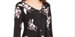 Blusa feminina Alfani estampada, manga comprida, decote em V, preta, tamanho pequeno