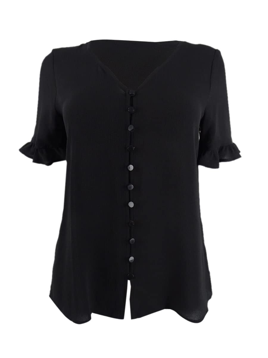 CeCe Sportswear Women's 3/4 Sleeve Ruffled Button Blouse, Rich Black, S