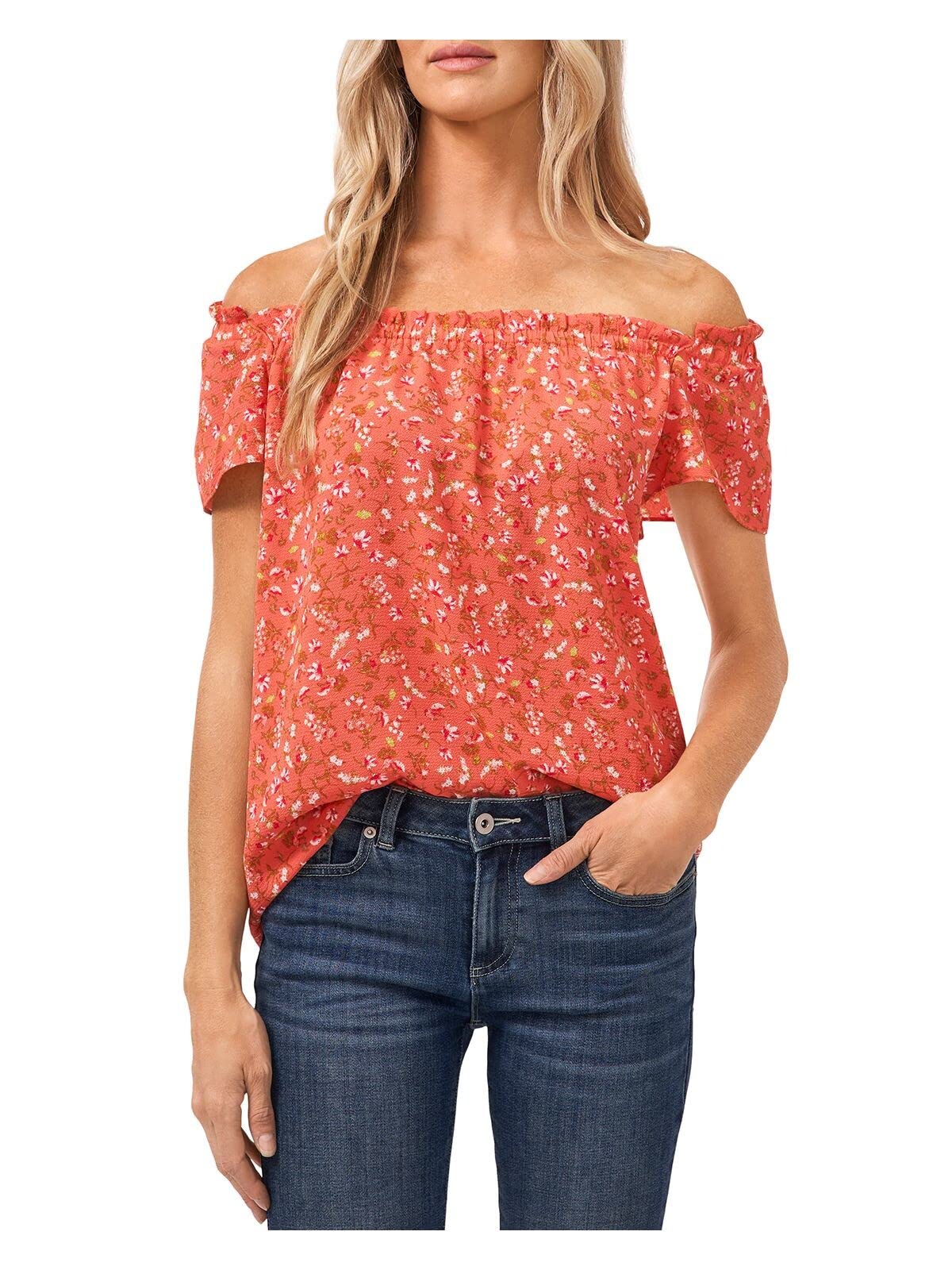 CeCe Short Sleeve Square Neck Floral Blouse Bay Coral SM