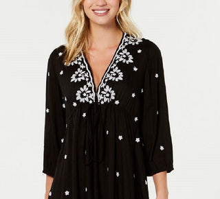 Raviya Vestido Feminino Bordado Manga 3/4 Saída de Banho Preto